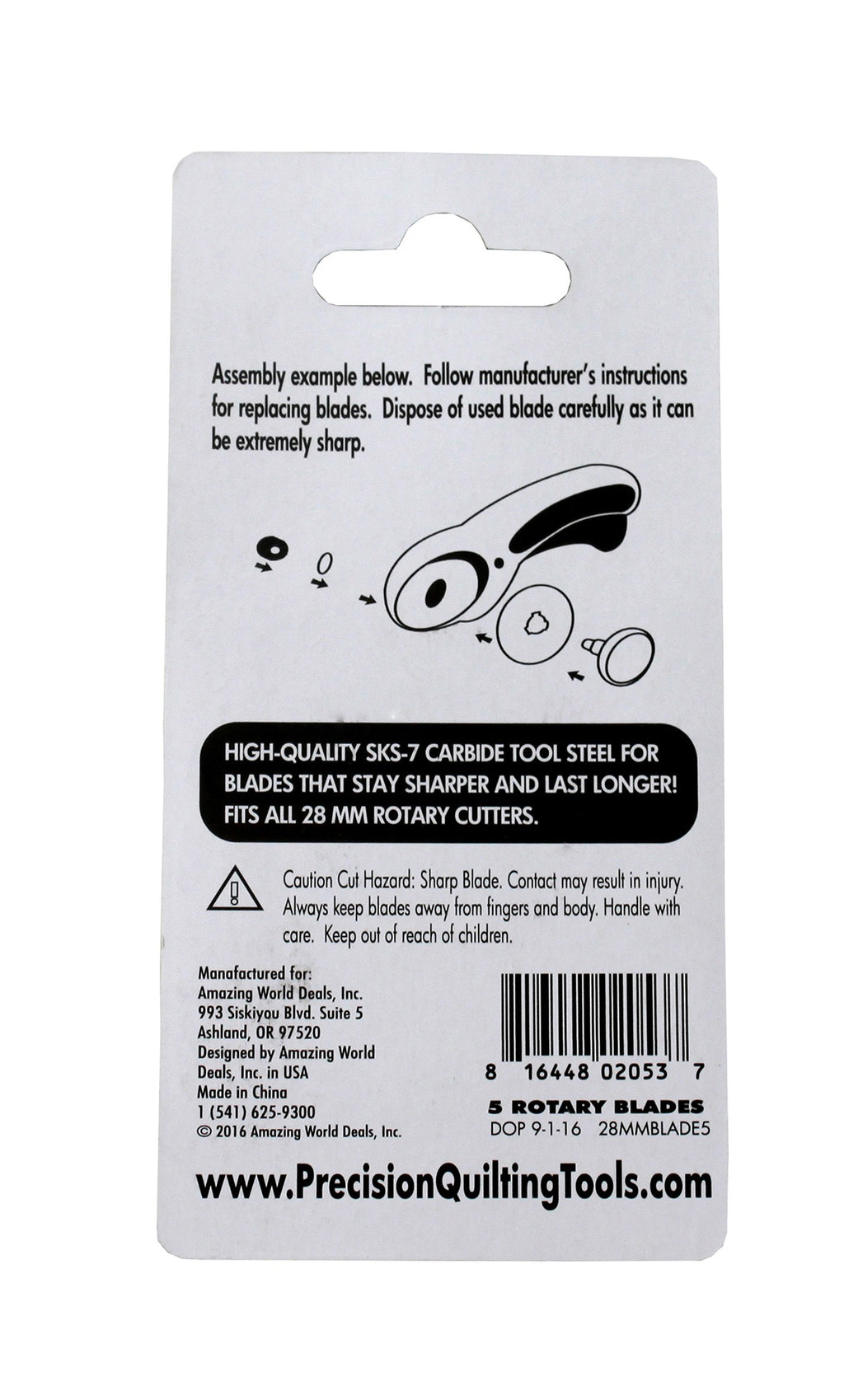 Precision Quilting Tools 28mm Rotary Replacement Blades (5 ct) made from high-quality SKS-7 Carbide Tools Steel for blades that stay sharper and last longer! Pre-lubricated to prevent rusting and corroding. Store your blades in the included snap case. Perfect for cutting multiple layers of fabric, fleece, felt, and more!