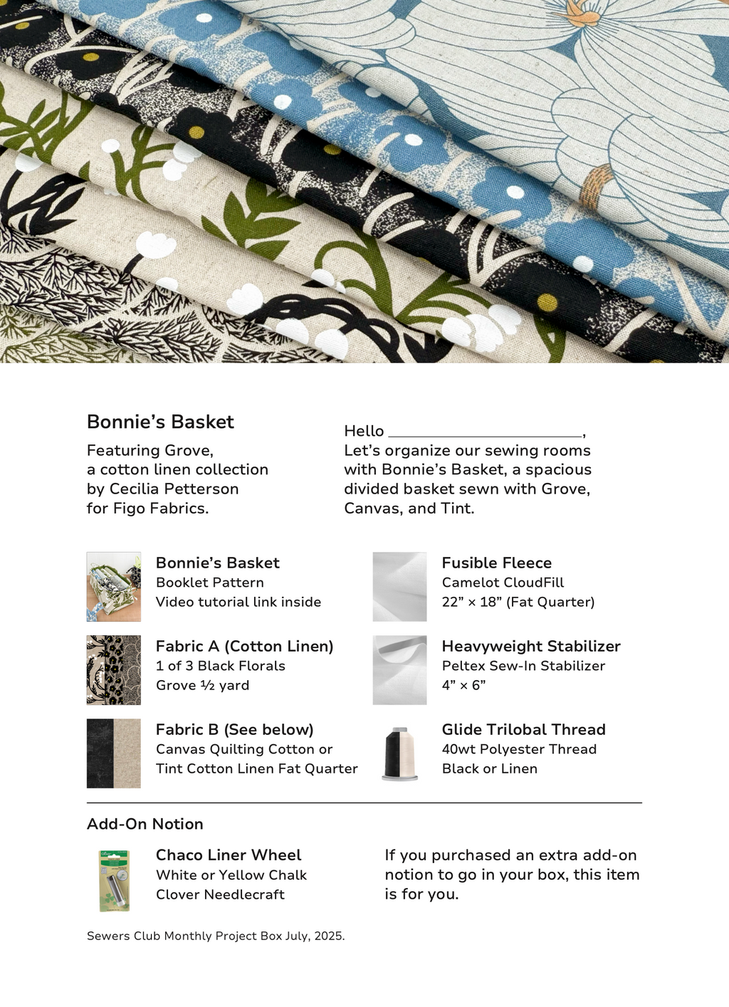 This Sewers Club Kit features the Bonnie's Basket pattern. It includes Grove by Cecilia Petterson and Space Dyes for Figo Fabrics. Kit makes one basket.