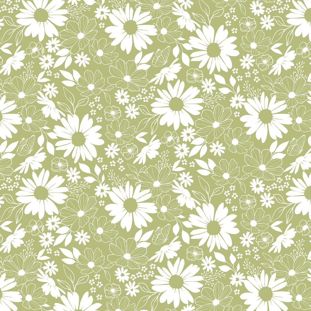 This enchanting fabric features a delightful green background adorned with a charming array of white floral patterns, including daisies and other small flowers. The design evokes a sense of vintage elegance with its toile-inspired aesthetic, making it perfect for a variety of crafting projects from apparel to home decor. The fabric's soft texture and vibrant print ensure it stands out, offering both style and comfort.
