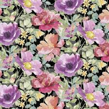 This enchanting fabric features a delightful floral pattern with a variety of flowers in shades of pink, purple, and yellow, set against a deep black background. The design showcases a charming toss of flowers including large peonies, small buds, and delicate leaves, creating a whimsical and elegant look perfect for various crafting and sewing projects.