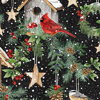 Winter Song by Deborah Edwards features Christmas themed fabrics which include cardinals and birdhouses.
